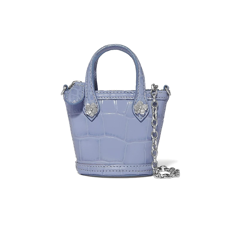 Fully made in iris colored croco leather, it has a detachable strap, tiny Everbloom metal flower ornament and a key ring with clip attached. Attach the chain and wear it crossbody. Or take the chain off and use the clip to attach to your bag. It can hold your Airpods or other small things inside.
