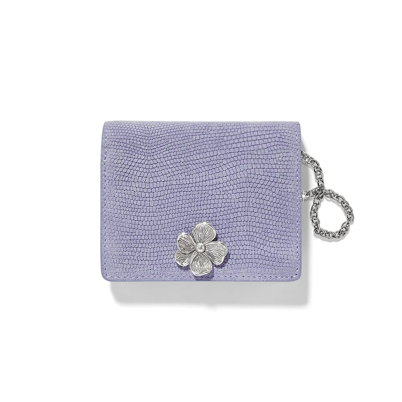 Crafted of iris-colored suede, this wallet features an Everbloom flower ornament and a detachable strap.