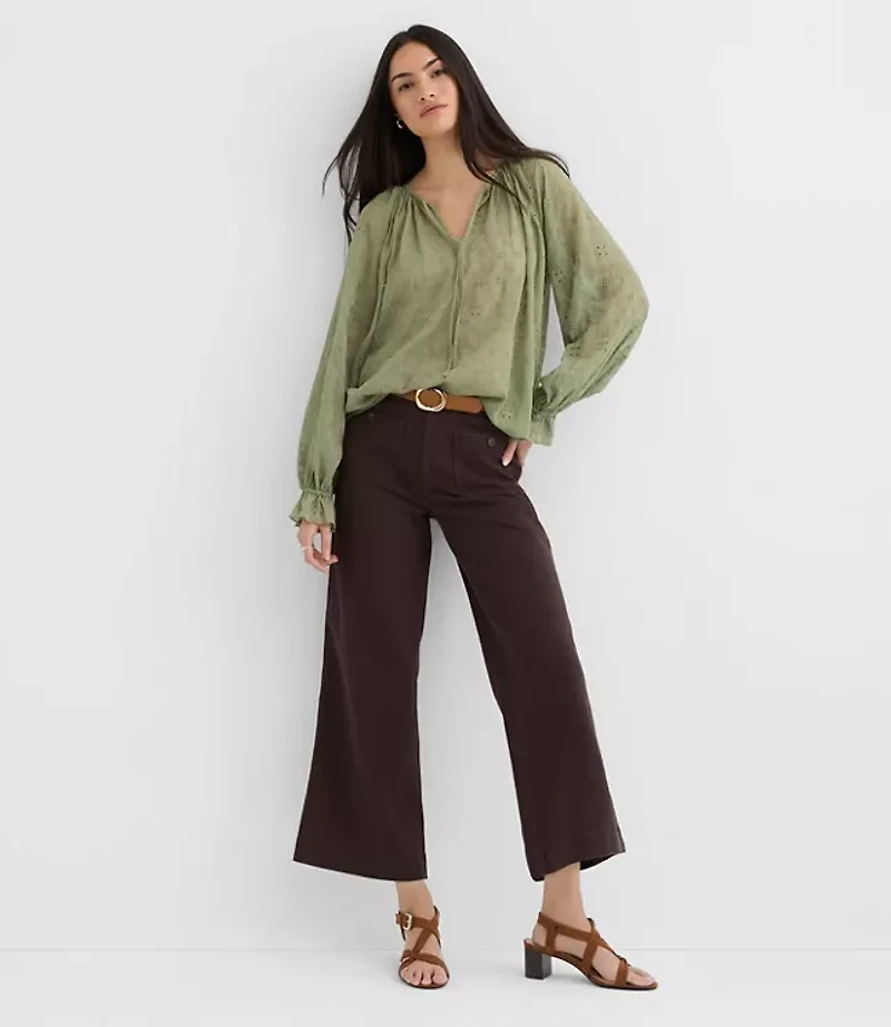 Eyelet Ruffle Cuff Tie Neck Blouse