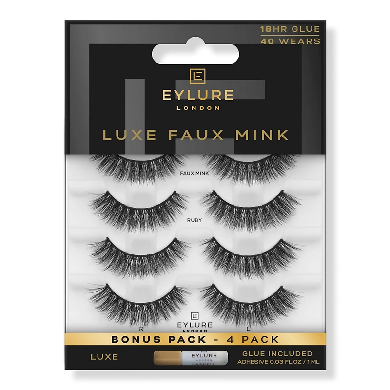 LUXE RUBY MULTIPACK (4) 0.03FLOZ. Features: Provides a natural, lightweight look with a soft, wispy finish. Glossy, tapered faux mink fibers for a high-end aesthetic. Handmade for quality and consistency in every application, and resusable for up to 10 wears. Includes latex-free lash glue with an 18-hour hold, perfect for all-day wear. Multipack includes a bonus lash for added convenience. : :