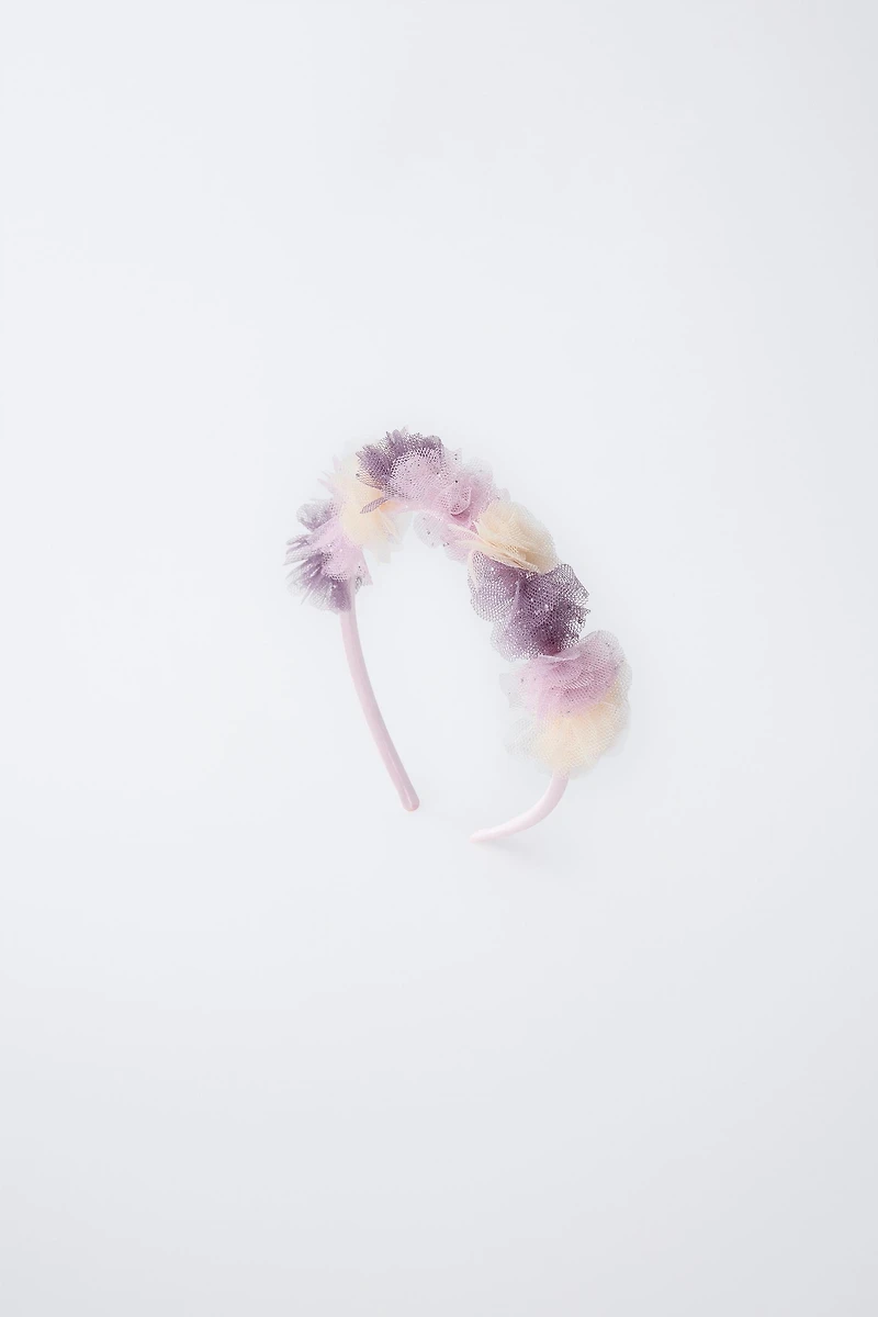 Headband with tulle appliqué and glitter flowers. Contains small parts, not recommended for children under 3 years old.