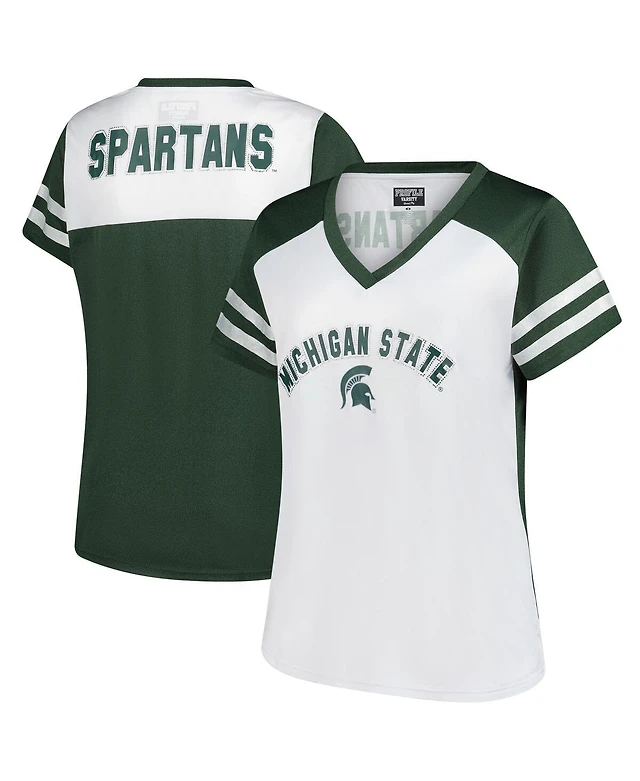 Fanatics Women's White Michigan State Spartans Plus Rhinestone Glitter Sleeve Stripe V-Neck T-Shirt