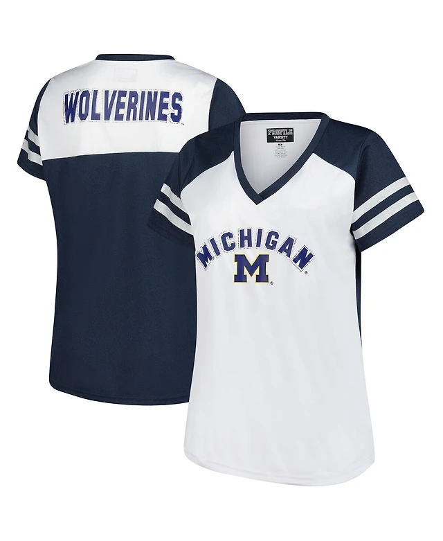 Fanatics Women's White Michigan Wolverines Plus Rhinestone Glitter Sleeve Stripe V-Neck T-Shirt