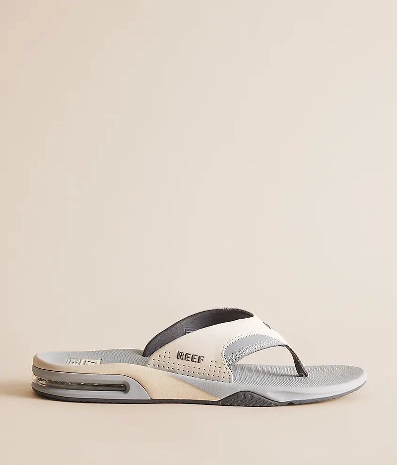 Faux leather strap flip Rubber textured footbed Bottle opener on bottom