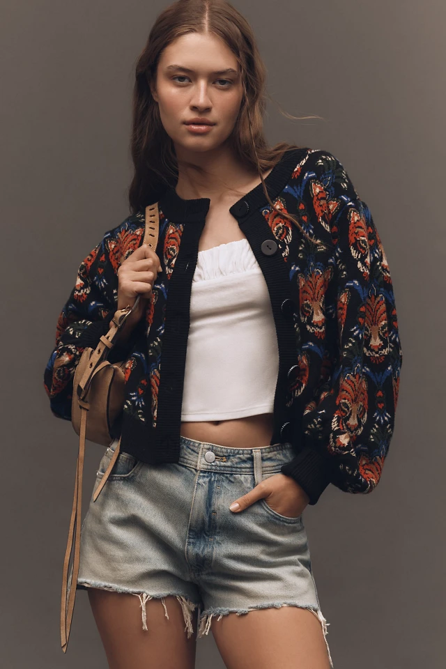 Farm Rio Balloon-Sleeve Tiger Cardigan Sweater