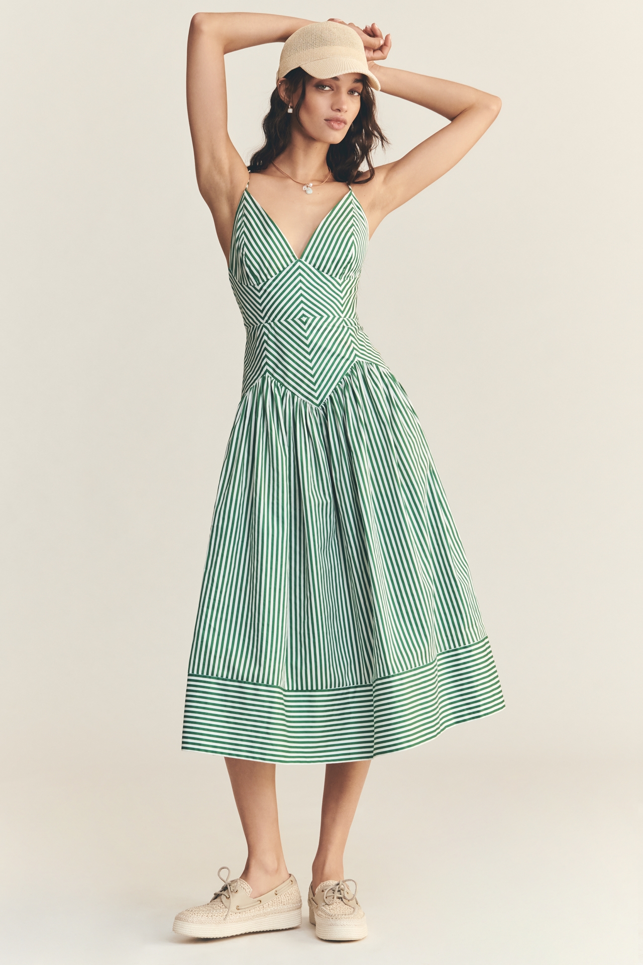 Made from 100% cotton, this midi features an eye-catching green and white striped design that dances across the fabric, along with a fitted bodice that flows into a drop waist and voluminous skirt.