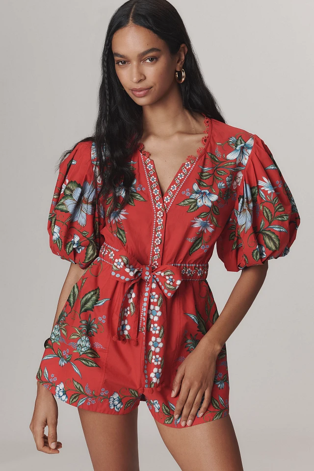Farm Rio x Anthropologie V-Neck Puff-Sleeve Linen Blend Romper