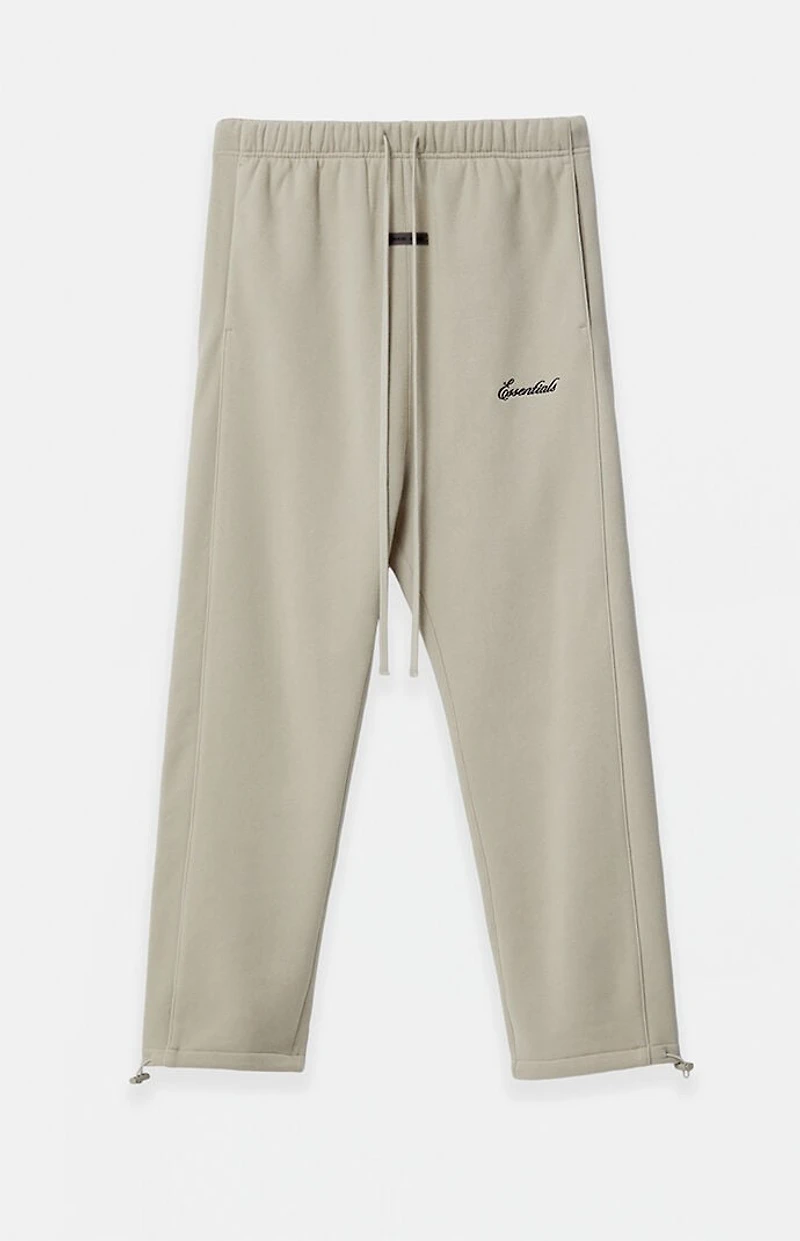 The Fear of God ESSENTIALS Abbey Stone Relaxed Fleece Sweatpants blend elevated comfort with a laid-back, oversized fit. Made with a soft fleece lining, they feature pintuck details, a drawstring waistband with long drawcords, side hand pockets, drawcord leg hems, wide leg openings, and a roomy fit through the seat and thigh, finished with a rubber brand label on the front and Essentials script logo embroidery at the hip.