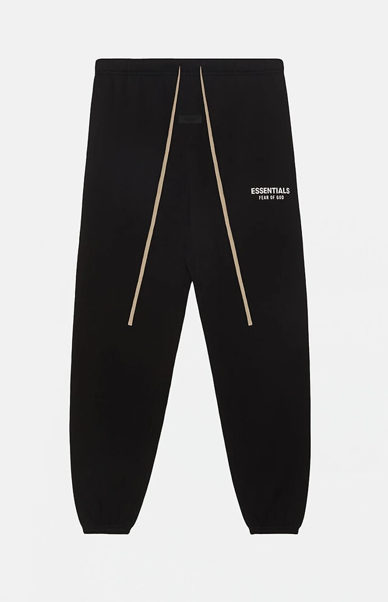 The Fear of God ESSENTIALS Black Fleece Sweatpants feature a relaxed fit through the seat and leg, a rubber brand label on the front, a Fear of God ESSENTIALS soft-touch logo graphic at the hip, side seam pockets, and elastic bands at the waist and cuffs.