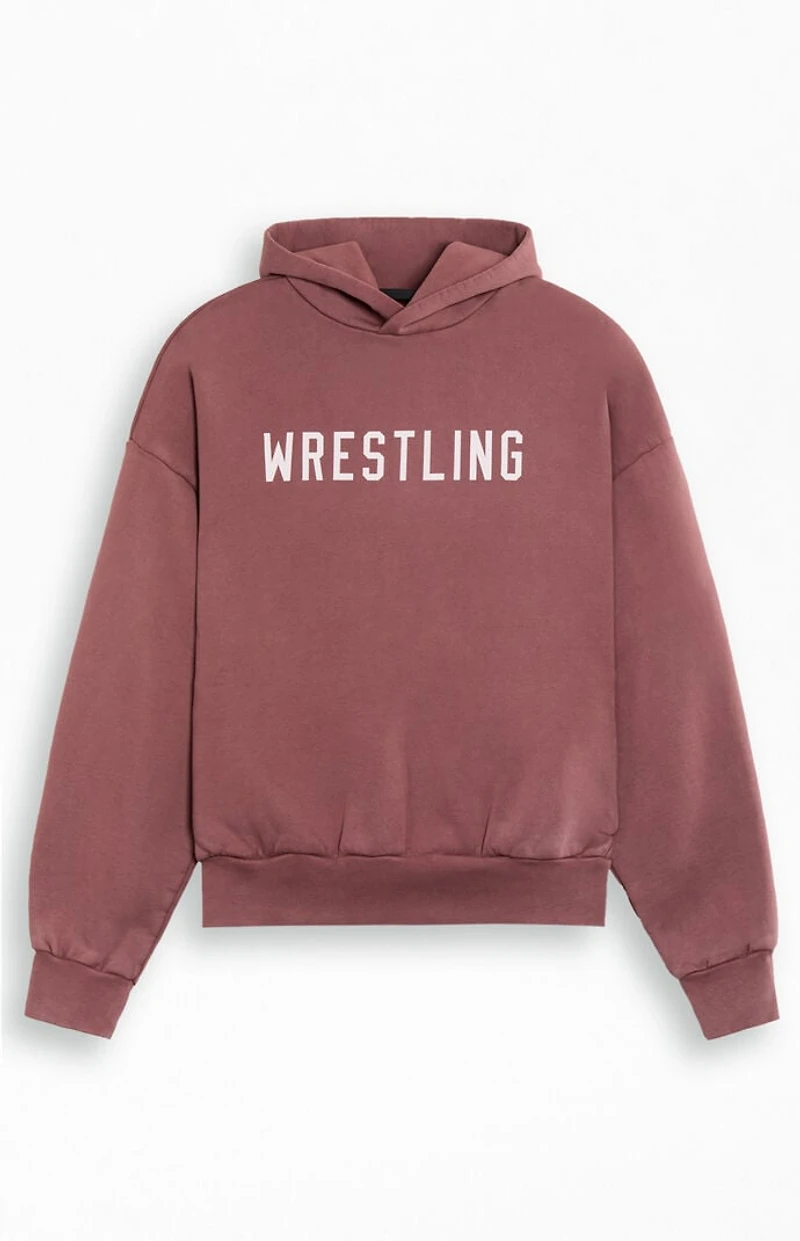 The Fear of God ESSENTIALS Crimson Heavy Fleece Hoodie is made from premium heavyweight cotton for added weight and warmth. It features long sleeves with dropped shoulders, an attached hood, a rubber brand label on the hood, side seam pockets, and a Wrestling screen print graphic on the front.