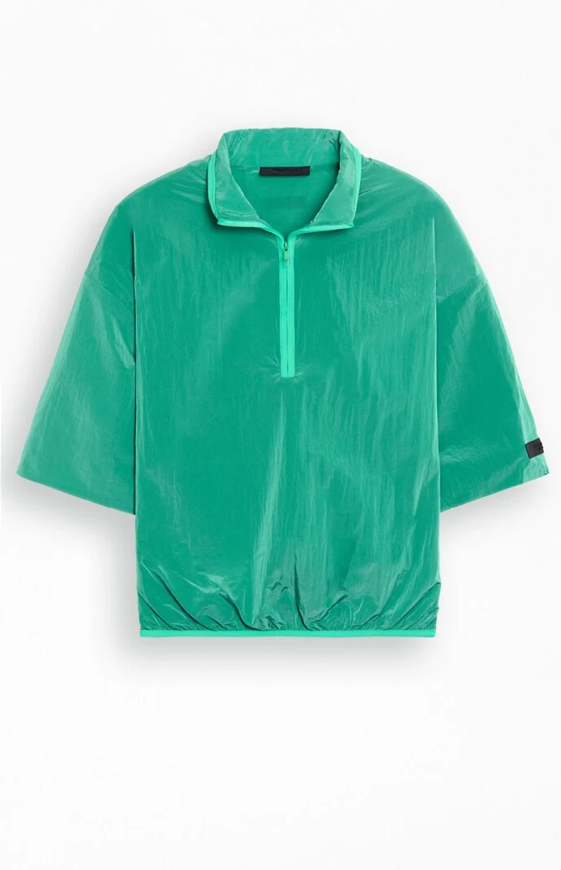 The Fear of God ESSENTIALS Mint Leaf Half Zip Mock Neck Shirt features a lightweight crinkle nylon fabrication, a half-zip front closure, a mock neckline, short sleeves, an elasticized hem, dropped shoulders, and rubber brand labels at the upper back and sleeve hem.