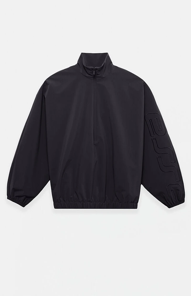Fear of God ESSENTIALS updates a classic layering piece with the Vintage Black Active Trace Half Zip Track Jacket, featuring dropped shoulders, a stand-up collar, and an oversized fit for relaxed, modern styling. Finished with Essentials embroidery down the sleeve, a half-zip front closure, hidden side seam pockets, elasticized cuffs and hem, and a rubber brand label at the upper back, it delivers clean, elevated streetwear with signature detailing.