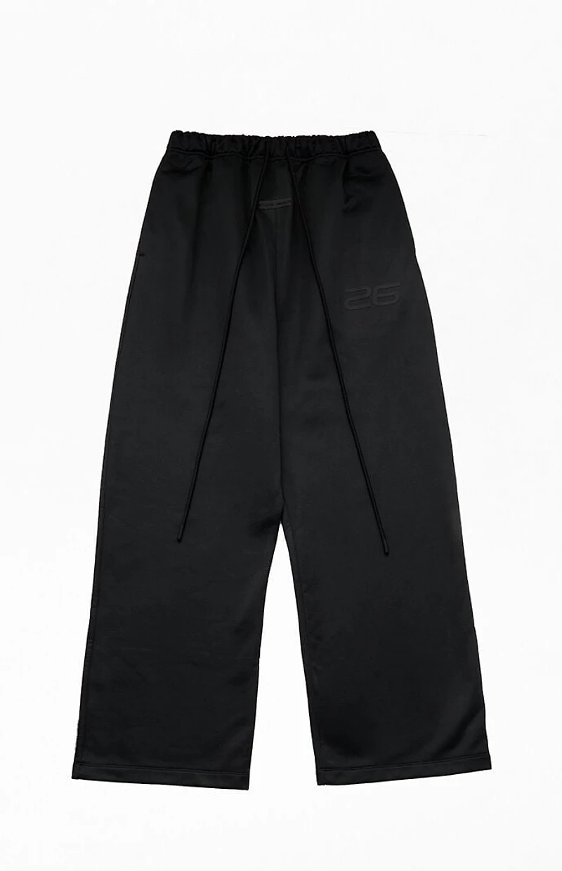 The Fear of God ESSENTIALS Vintage Black Lounge Baggy Sweatpants are built for laid-back comfort with a bold, oversized silhouette. They feature a drawstring waistband with long drawcords, side hand pockets, wide leg openings, a roomy fit through the seat and thigh, a rubber brand label on the front, and a 26 soft-touch graphic at the hip.