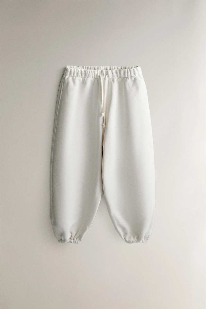Long trousers made of felt fabric, in a plain color, with an elastic waistband, adjustable drawstrings, and cuffed hems.