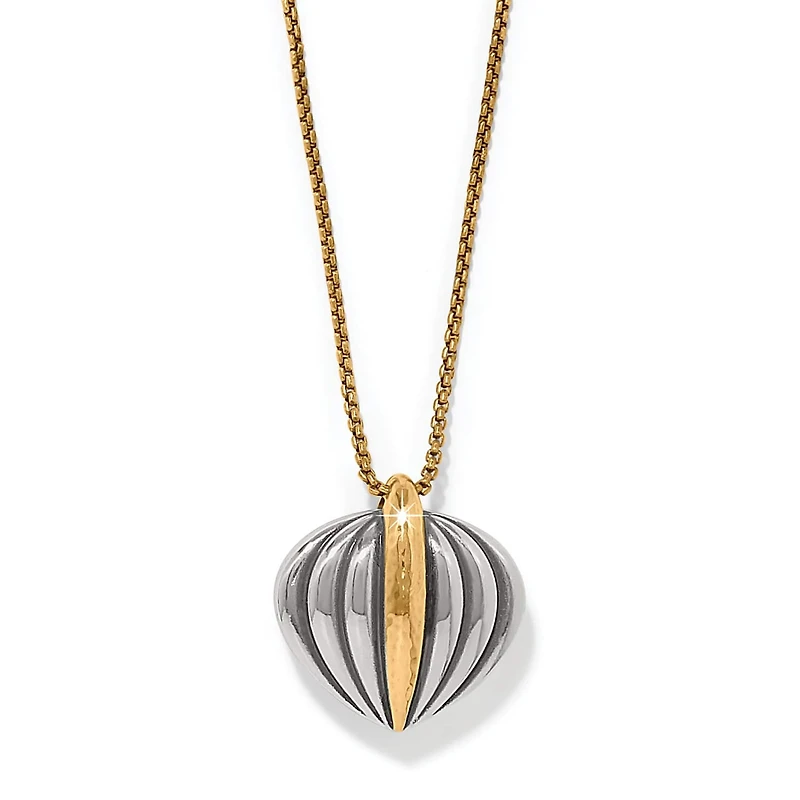 Art Deco-inspired, this curvaceous pendant necklace has simplicity, symmetry and repetition of linear elements – its geometric shapes and lines are blended with sweeping curves. A timeless piece!