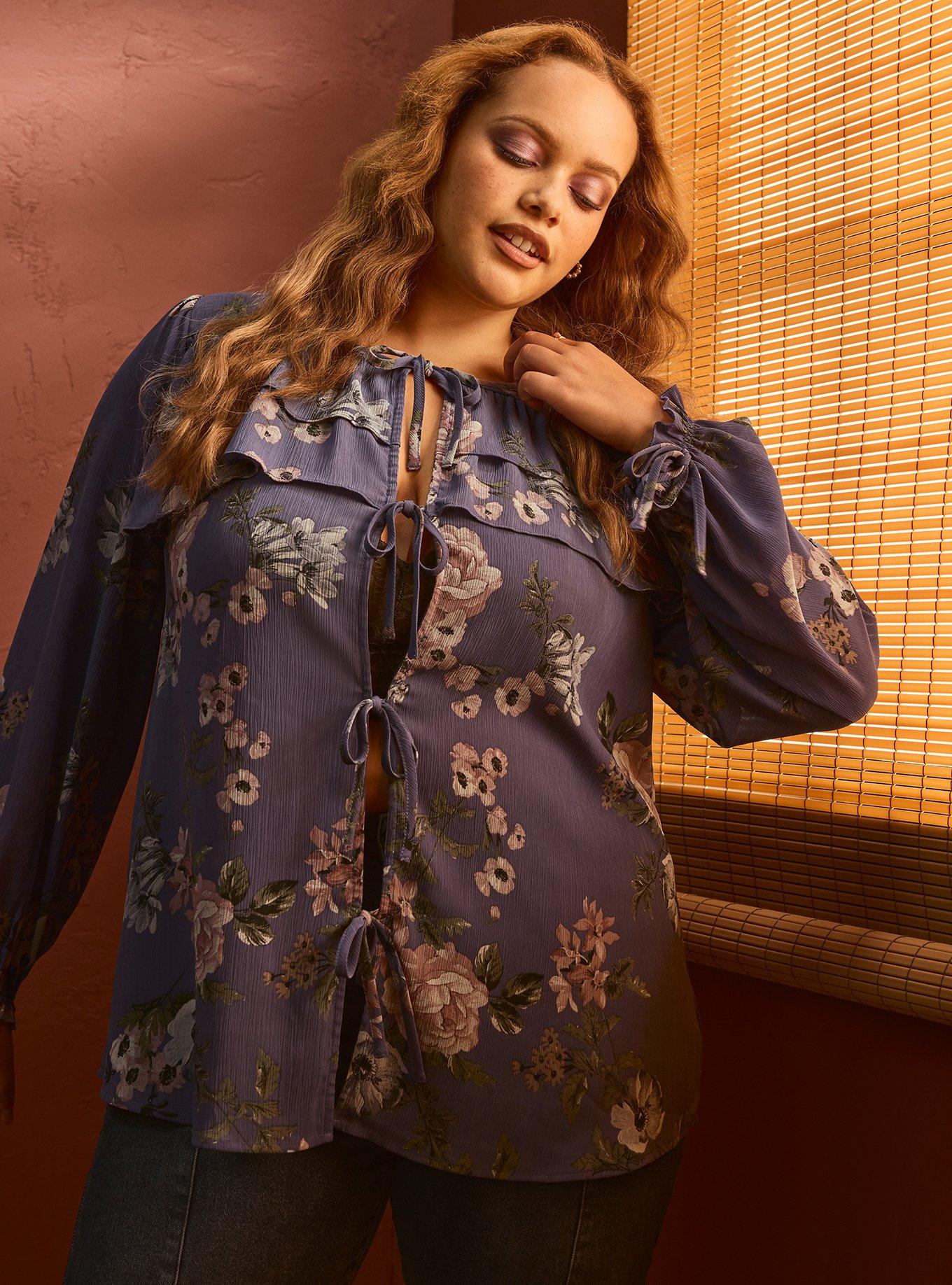 FIT Measures 33'' from shoulder (size 2). MATERIALS + CARE Crinkle Chiffon woven fabric: A semi-sheer, lightweight fabric that drapes beautifully. Stretch level: None. 100% polyester. Machine wash cold. Dry low. Imported. DETAILS Crew neckline. Long balloon sleeves with self ties. Ruffles at front and bake yokes. 4 self ties down front. FESTI Beautiful, evocative pieces for free spirits and the wild at heart. All dreamed up to tell your story. Your next adventure starts here.