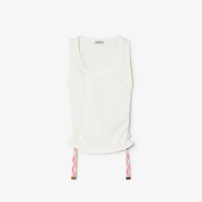 Debuted on the Burberry Summer 2025 runway, a rib-knit tank top in a cotton blend jersey. Cut to a slim fit, the ruched sides can be adjusted with the Burberry Check side straps and B buckles.