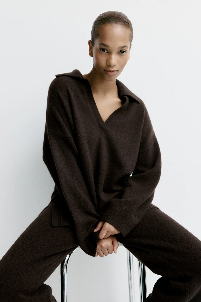 Slightly longer, loose-fit jumper in a soft, fine knit with a ribbed collar and V-shaped opening at the top. Dropped shoulders and long sleeves with ribbed cuffs. Straight, ribbed hem with a slit at each side. Longer at the back.