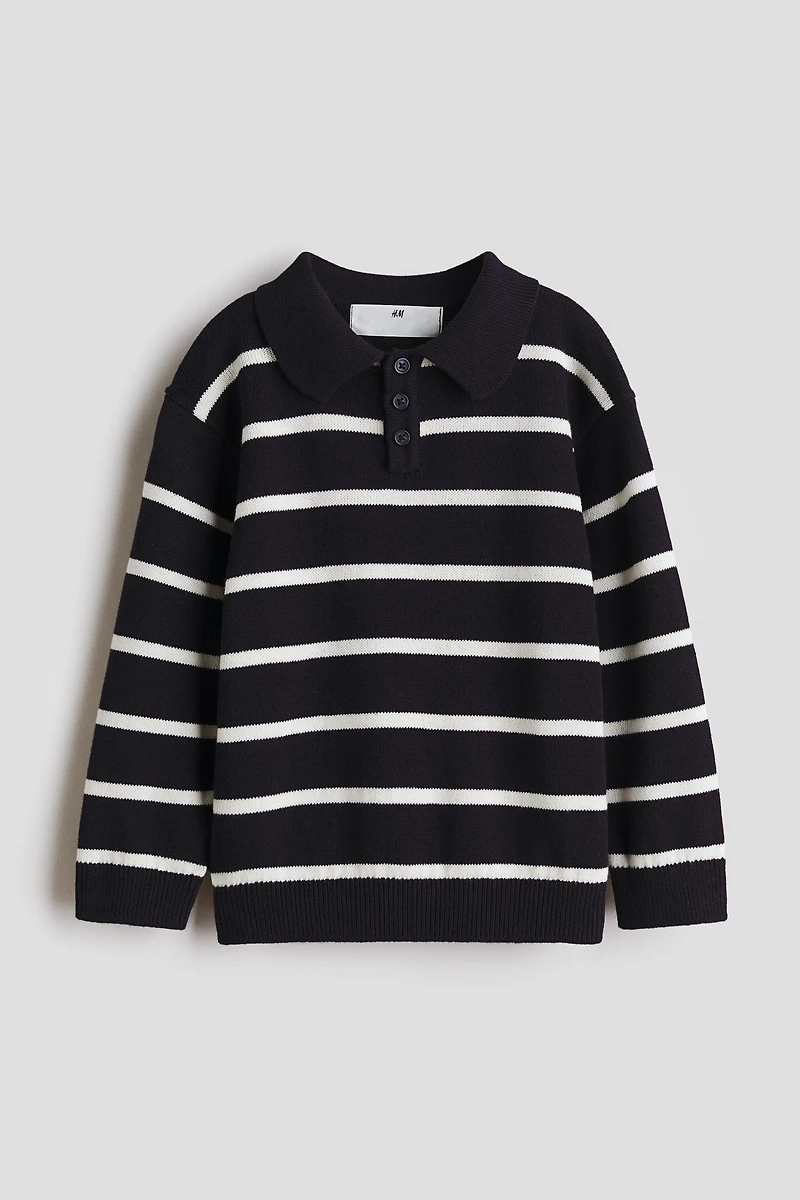Fine-knit polo shirt in soft cotton. Collar, short button placket, dropped shoulders, and long sleeves. Ribbing at collar, cuffs, and hem.
