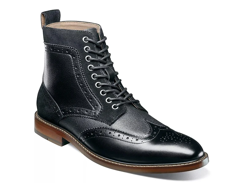 Head out in stunning style with the Stacy Adams Finnegan boot. The wingtip design, contrasting colors and striking perfing details add fashion points to this lace-up boot supported by a stacked heel.