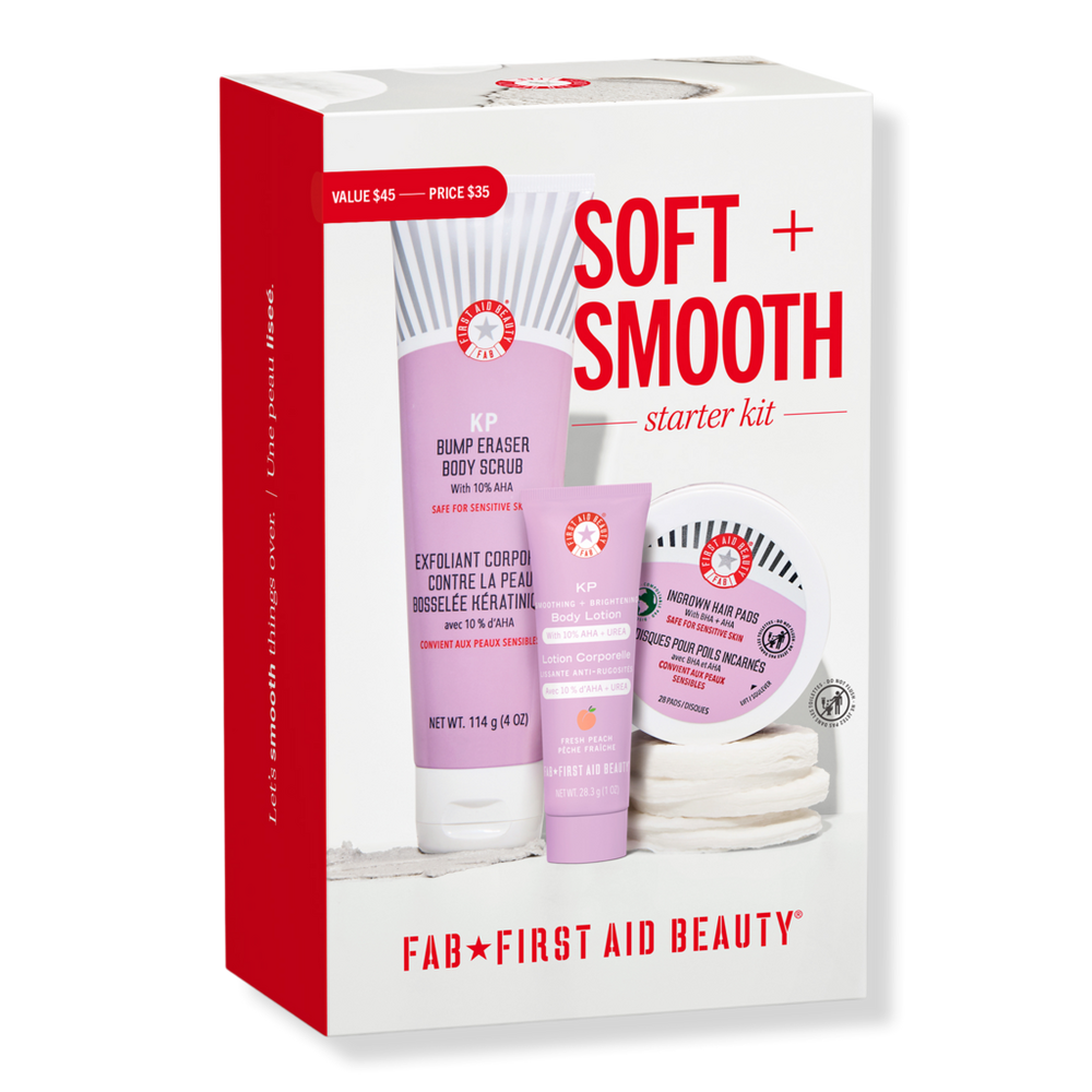 SOFT + SMOOTH STARTER KIT. Benefits: Get touchable, healthier-looking skin with this body-smoothing routine.. Exfoliate 2-3x/week using KP Bump Eraser Body Scrub with 10% AHA.. On non-scrub days, hydrate + resurface skin using KP Smoothing Body Lotion with 10% AHA (in new Fresh Peach scent!).. Help prevent razor burn + ingrown bumps with Ingrown Hair Pads.. Key Ingredients: Glycolic & Lactic Acids: Help exfoliate skin, brighten and improve texture. Salicylic Acid: Helps brighten skin, smooth texture and purify. Pumice Buffing Beads: Natural exfoliating particles remove dead cells to brighten & smooth skin. Includes: KP Bump Eraser Body Scrub with 10% AHA (4.0 oz). KP Smoothing Body Lotion with 10% AHA (Fresh Peach) (1.0 oz). Ingrown Hair Pads (28 ct).