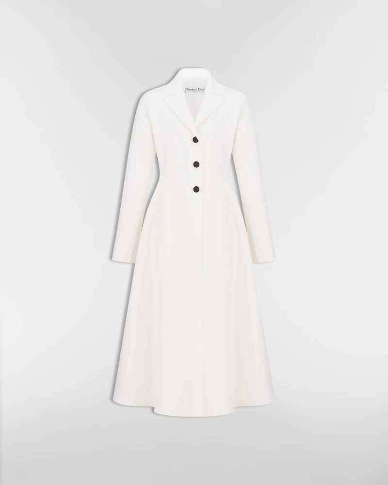 The coat is both timeless and elegant. Crafted in ecru double-sided virgin wool and cashmere, it features a flared silhouette elevated by slit pockets. The style is further enhanced by a black horn button closure on the front. The sophisticated coat will elevate any attire with a touch of refinement.