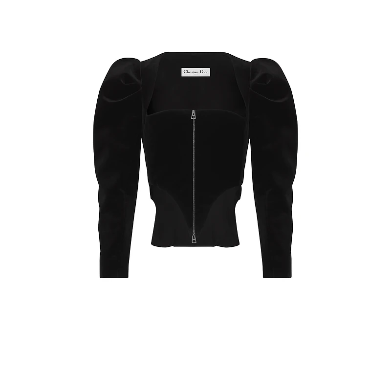 Unveiled at the Autumn-Winter 2025-2026 Fashion Show, the jacket celebrates the collection's opulent elegance. Crafted in black cotton velvet, it features a cropped, fitted silhouette with a corseted effect and a zipper highlighting the waist, while puff sleeves lend couture-inspired volume to the shoulders. The jacket can be paired with the matching Bermuda shorts for a hallmark look. Front zip closure. Tonal lining. 100% cotton and lining: 100% silk. Made in France