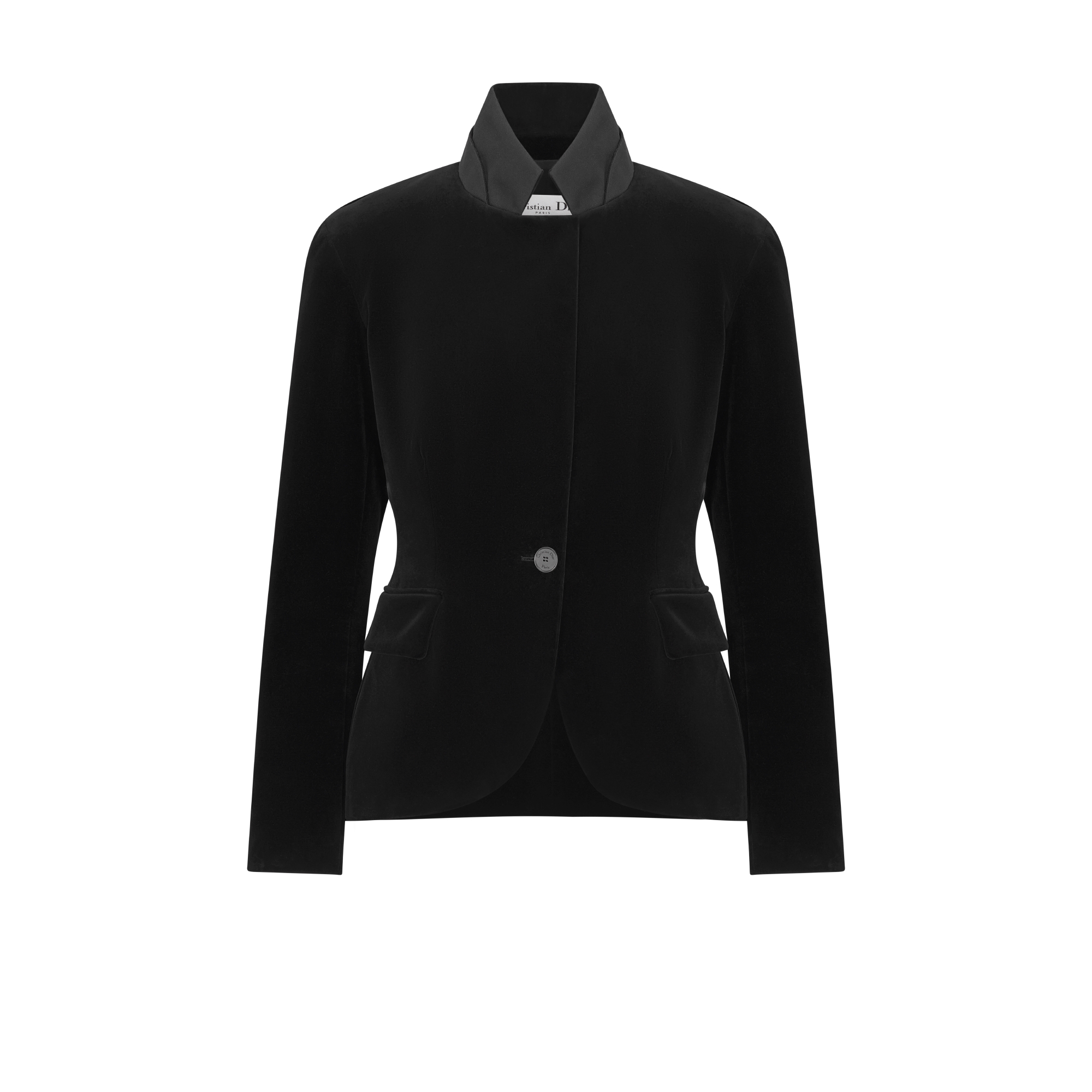 Revealed at the Autumn-Winter 2025-2026 Fashion Show, the timeless jacket is revisited with the House's couture spirit. Constructed in black cotton velvet, it is enhanced by a collar that can be turned up. Flap pockets define the waist with a refined, tailored touch, while the curved hem accentuates its elegant lines. The jacket will pair well with a ruffled blouse and the matching Bermuda shorts for a couture look.