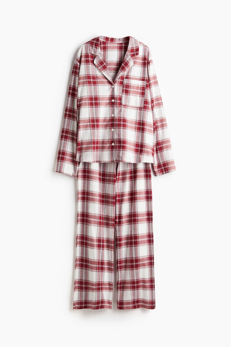 Pajamas in soft cotton flannel with a shirt and pants. Long-sleeved shirt with a resort collar, buttons at front, and a patch chest pocket. Pants with an elasticized, drawstring waistband.
