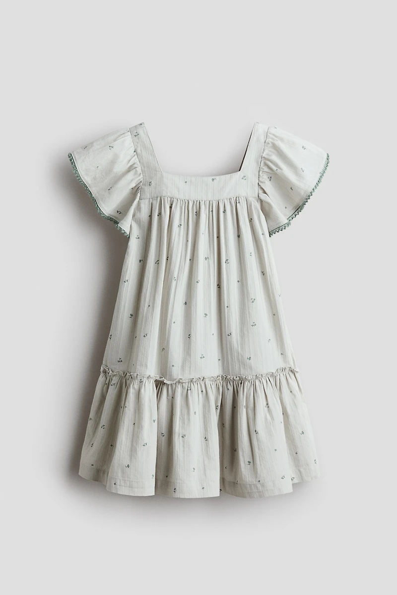 Flared dress in soft woven cotton. Square neckline, gathered seam around top, and butterfly sleeves. Ruffle-trimmed tier around skirt for added volume. Unlined.