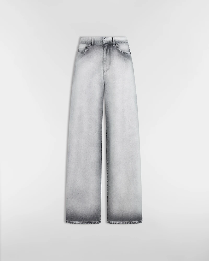 The denim jeans showcase an elegant flared cut. Crafted in gray stonewashed cotton denim, they are embellished with a Christian Dior Paris leather tag on the back. Featuring pockets on the front and back, the jeans will complete outfits throughout the seasons.