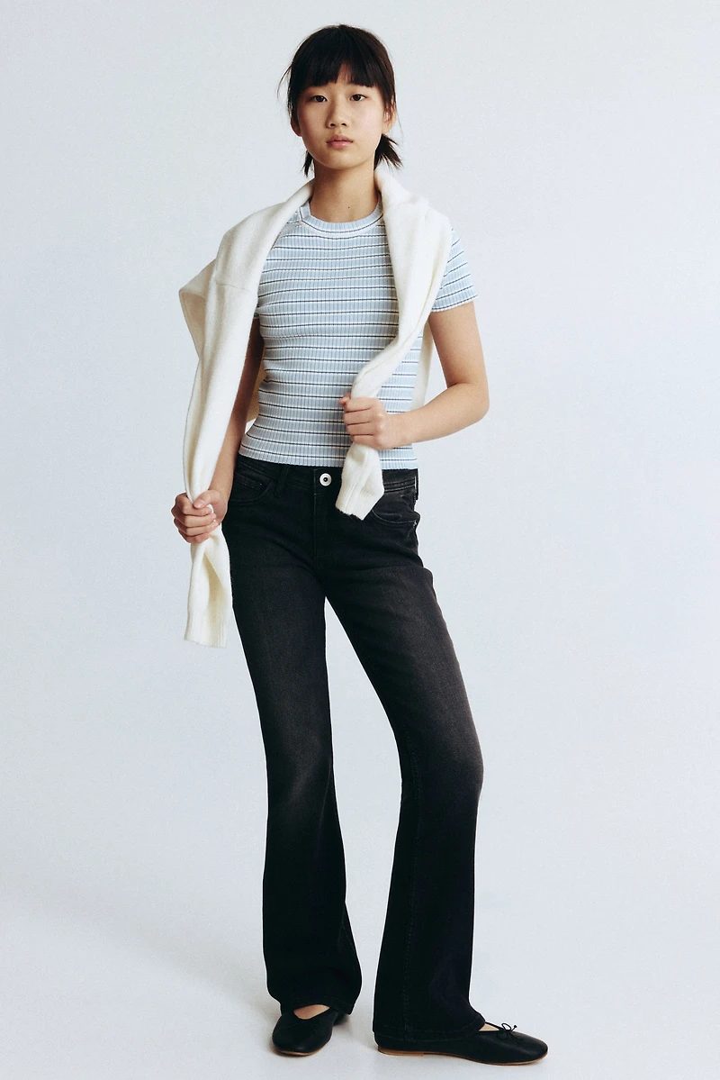 Jeans in stretch denim with a slim fit through hip and thigh. Low waist, adjustable elastic at waistband, and zip fly with button. Front pockets, back pockets, and flared legs.