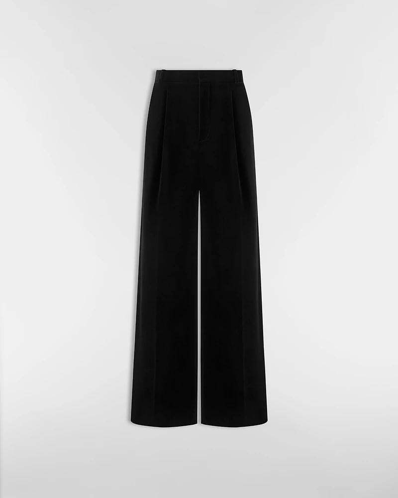 The pants present timeless and sophisticated Dior lines. Crafted in black cotton velvet, they are distinguished by an elegant flared silhouette enhanced by darts that lend structure, as well as side pockets and a rear piped pocket. The pants can be paired with a ruffled blouse and the matching jacket to complete a couture look.