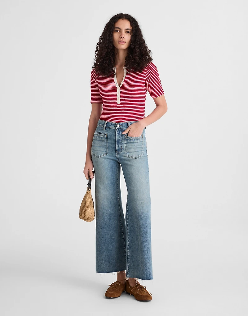 - The fabric: vintage-y stretch denim that hugs the body and bounces back like a pro (AKA no 3pm bagginess).
