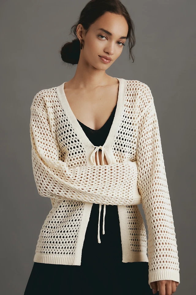 Flat White Long-Sleeve Crochet Tunic Top
