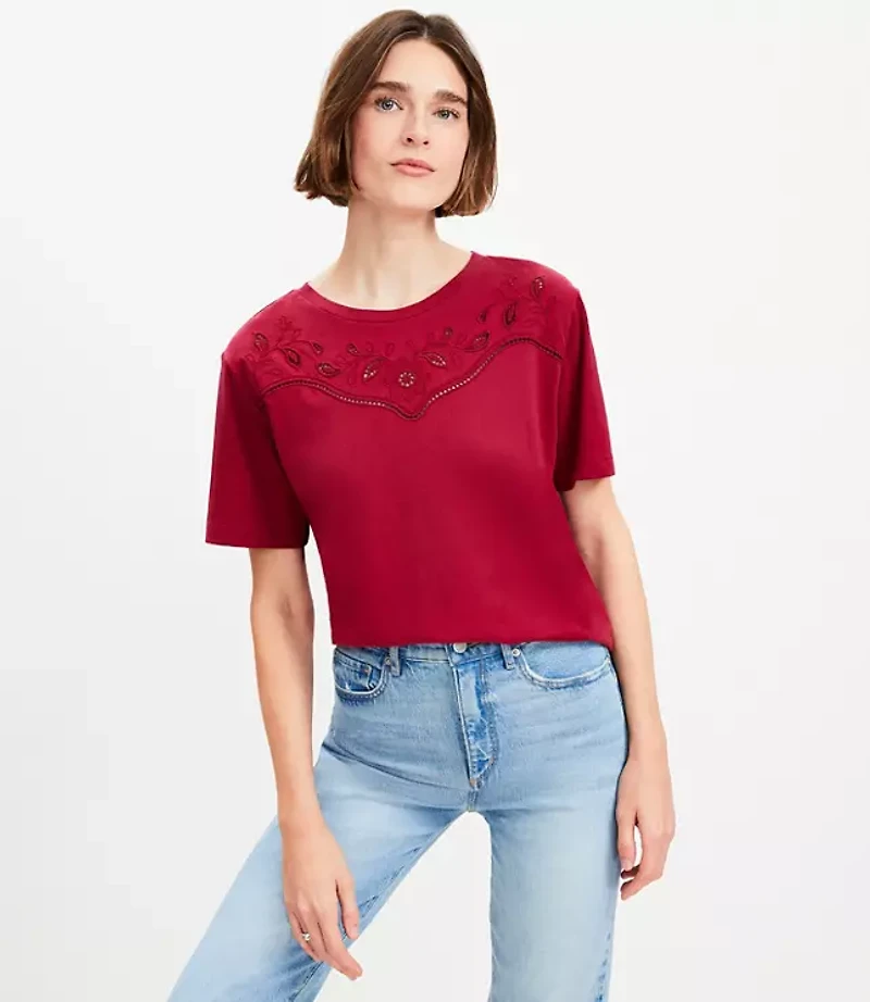Done in a soft cotton knit with a floral cutout lace yoke, this tee is irresistibly and effortlessly pretty. Crew neck Short sleeves, Bullet1: 22 3/4"long, Imported:, Fit: Classic follows your contours with a little room, Length: Abbreviated - hits at natural waist, Fabrication: 100% Cotton, Garment Care: Machine Washable Loft Floral Cutout Lace Yoke T - Shirt Size Small Crimson Blush Women's by Loft Size Regular - S Crimson Blush Women's 100%, Cotton Crew Neck Short Sleeve Tees Tops Wear To Work 100% Cotton Machine Washable