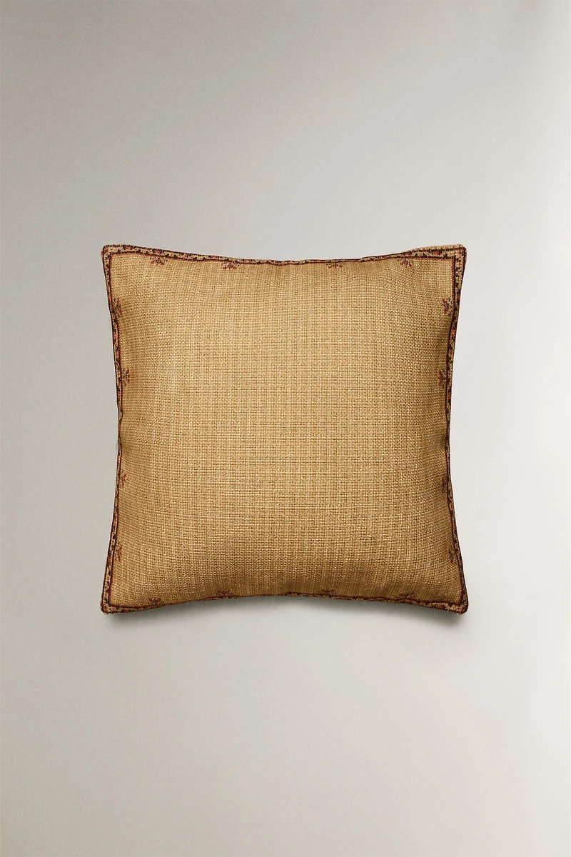 Cotton throw pillow cover with a contrasting border and floral details. Cushion insert not included.