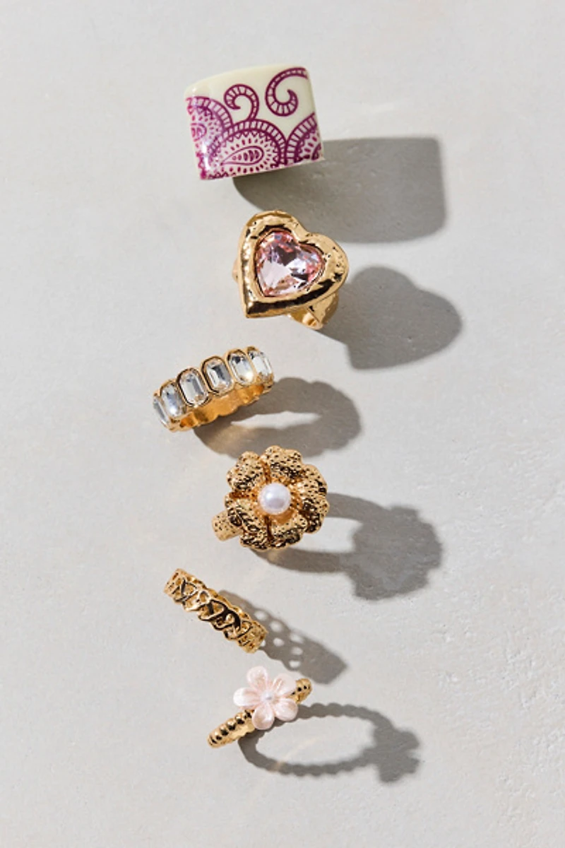 This set of six statement rings features a mix of romantic styles and finishes for a curated look. Designed with sweet details, they can be worn solo or stacked together.