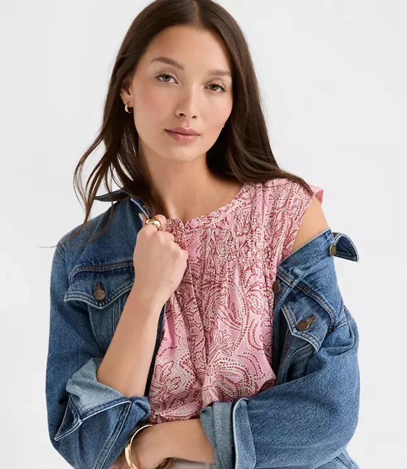 Finished with the softest knit back, this fluid woven cotton shell effortlessly pops your style with fresh polish - thanks to an artfully pleated yoke. Crew neck Sleeveless Henley button placket., Hit: Hits at hip, Imported:, Length: 24"long, Fabrication: Front 100% Cotton, Back: 100% Rayon, Garment Care: Machine Washable Loft Floral Pleated Yoke Mixed Media Shell Top Size 2XS Misted Rose Women's by Loft Size Regular - 2XS Misted Rose Women's Crew, Neck Sleeveless Tanks & Shells Tops Wear To Work Front: 100% Cotton Back: 100% Rayon Machine Washable