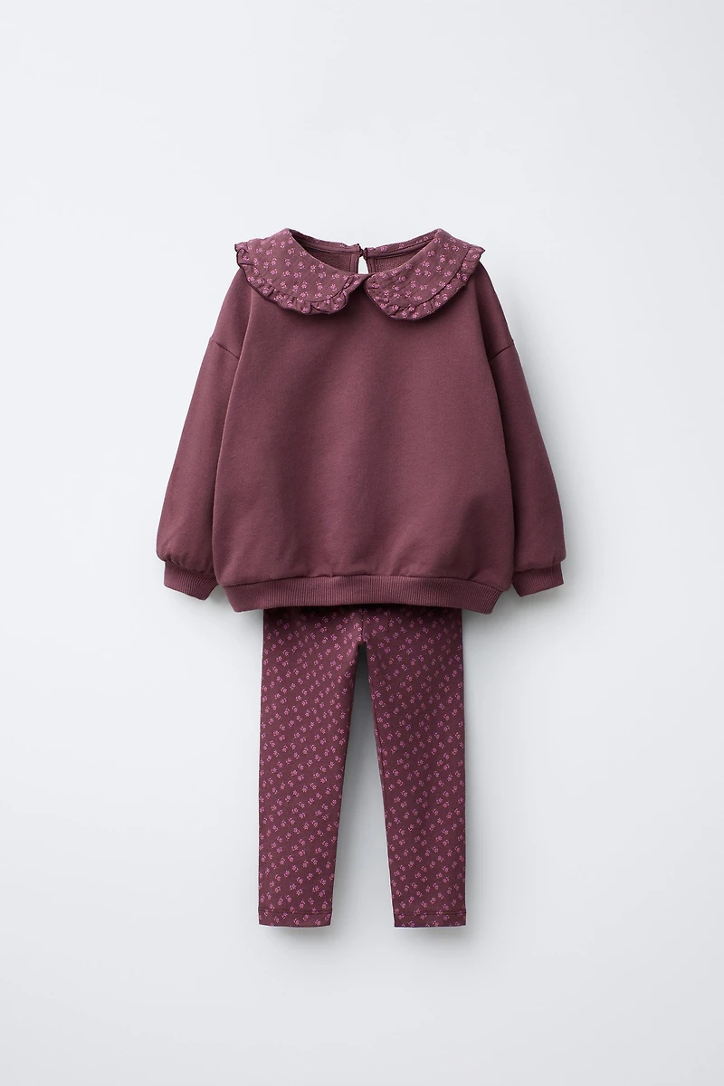 Two-piece set. Sweatshirt with a bib collar and floral print. Ribbed trim. Teardrop button closure at the back. Leggings with an elastic waistband and floral print.