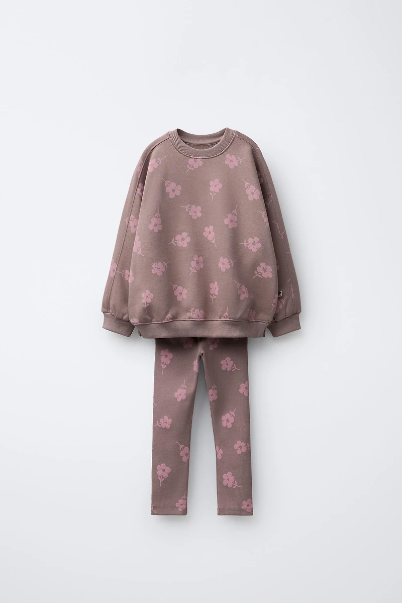 Two-piece set. Round neck sweatshirt with long sleeves. Rib trim. Brushed, warm, and soft interior quality. Rib leggings with an elastic waistband. Floral print.