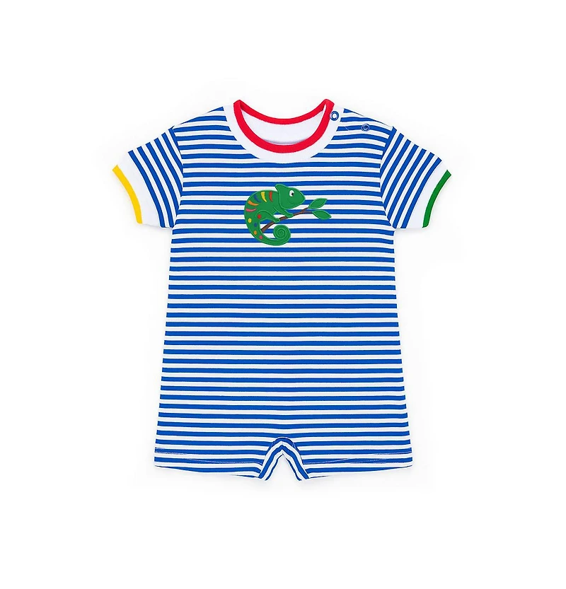 Playful and cool for warm-weather days, this shortall is crafted from royal and white yarn-dyed stripe interlock knit for softness and durability. A cheerful applique lizard brings a fun pop of color to the front, while white rib trim at the neck and sleeves—finished with multicolor tipping—adds a sporty touch.Shoulder snaps and inseam snaps make dressing and changes quick and easy, keeping little ones comfortable through every sunny adventure.