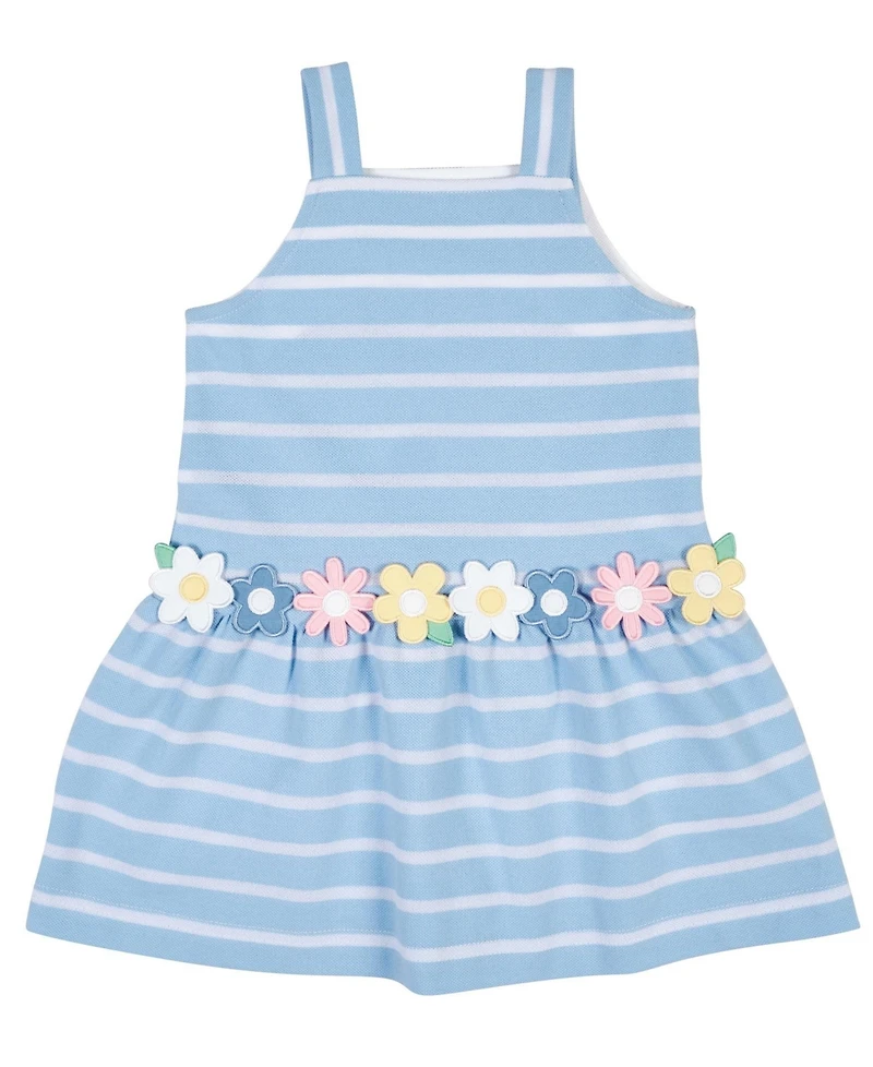 Bright and breezy, this dress is crafted from light blue and white yarn-dyed stripe pique knit in soft, breathable 100% cotton—perfect for warm-weather days. Multicolor pastel flowers bloom across the front waist, adding cheerful color and a sweet, summery touch. Adjustable shoulder straps with back buttons ensure a comfortable, flexible fit, while the drop waist silhouette and softly shirred skirt create easy movement. Falling above the knee, it s ideal for sunny vacations, spring outings, and picture-perfect moments in the sunshine.