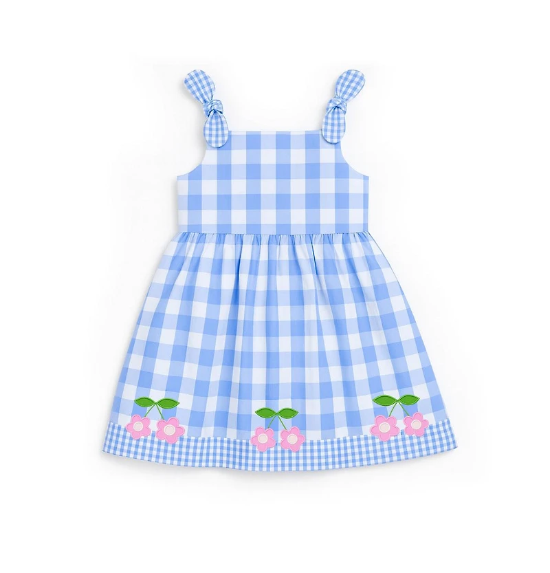Fresh and playful, this dress is crafted from blue and white gingham poplin in a mix of large and small checks for a charming, dimensional look. Applique cherry flowers add a sweet burst of color, while shoulder ties bring a soft, summery touch. The classic waist dress silhouette features a softly shirred skirt that falls to the knee, and a back zipper keeps dressing easy and polished. Perfect for warm-weather outings, spring celebrations, and picture-perfect days.