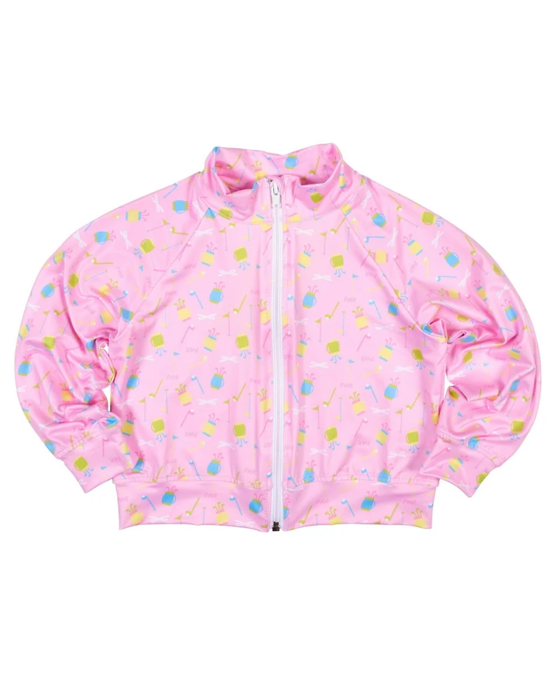 Sporty, lightweight, and perfect for warm-weather adventures, this cropped jacket is crafted from our pink golf print performance knit with soft stretch for all-day comfort. A front zipper adds ease and versatility, making it an ideal layer over tees, tanks, or the matching golf print dress.Designed for vacations, sunny outings, and playful days on the move, it delivers a polished, athletic look with effortless charm.