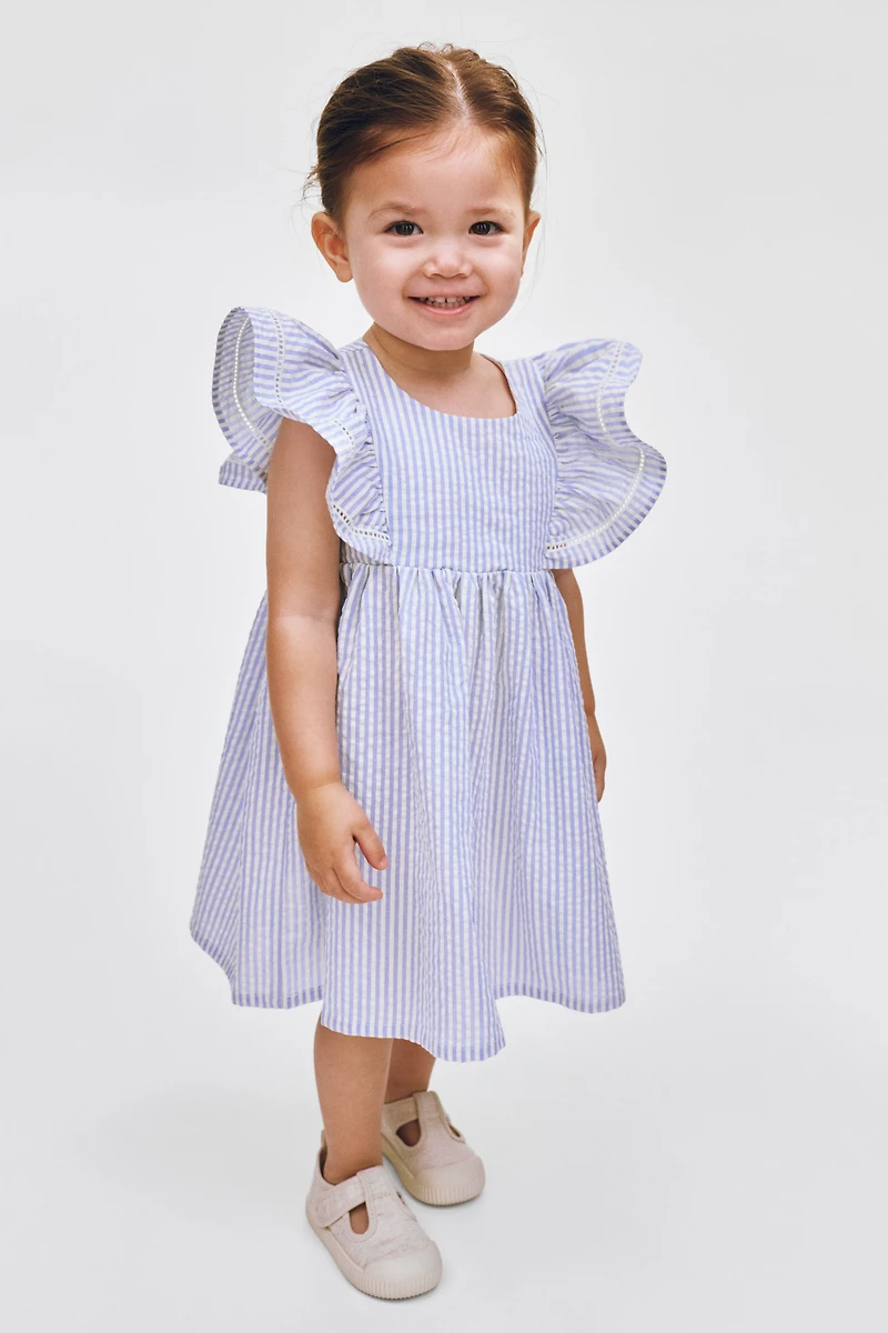 Dress in soft cotton seersucker. Round neckline, opening at back with buttons, and wide flounces at front extending over shoulders to back. Gathers above a flared skirt. Lined bodice.