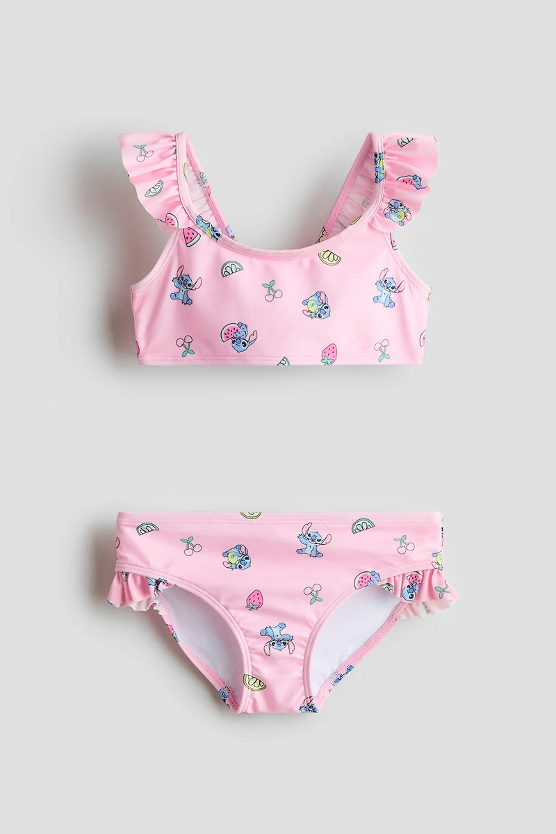 Fully lined two-piece swimsuit with a top and matching briefs, both with a printed design. Top with flounced shoulder straps and a round neckline. Briefs with flounce trim at top of leg openings.