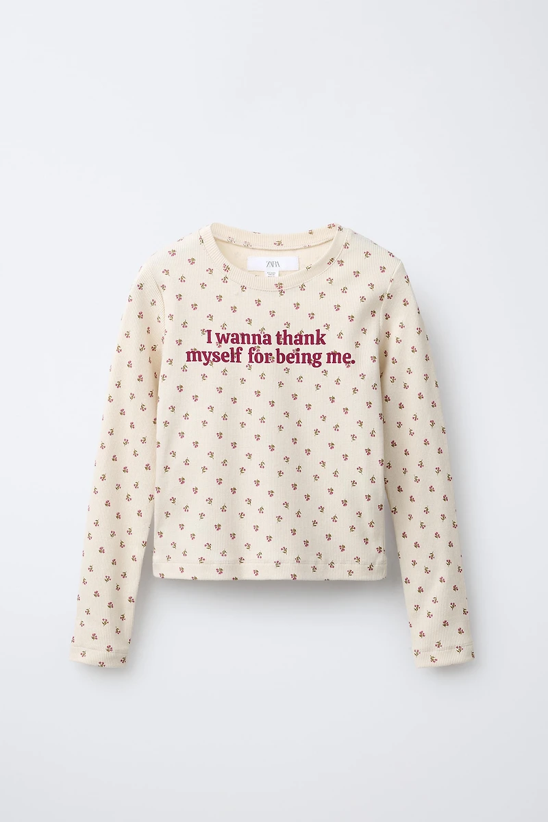 Round neck long sleeve T-shirt. Floral and text print on the front.