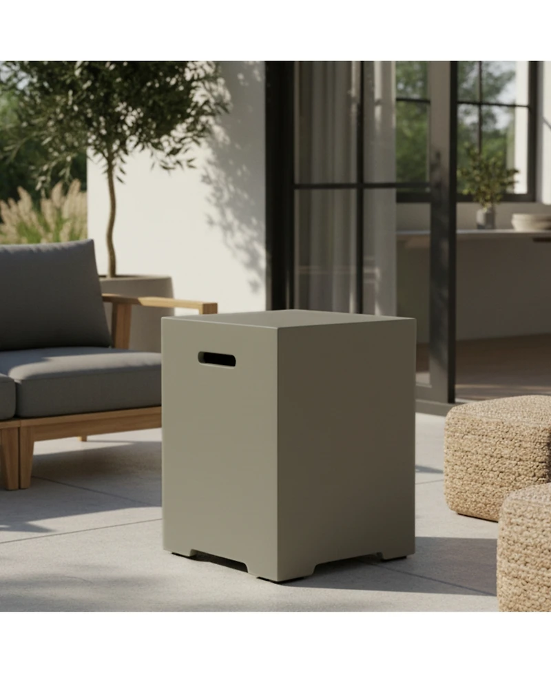 This 16 inch 20 Lb propane tank cover doubles as an outdoor hideaway table. Made of durable MgO composite with side handles adjustable foot pads and hose hole fitting standard 20 Lb tanks for fire pits Bbq grills.