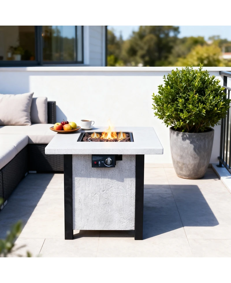This 28 inch square 25 inch H propane fire pit table delivers 50000 Btu. Made of fiberglass iron and 304 stainless steel core it has realistic charcoal grain Csa certified with tabletop cover for coffee table conversion.